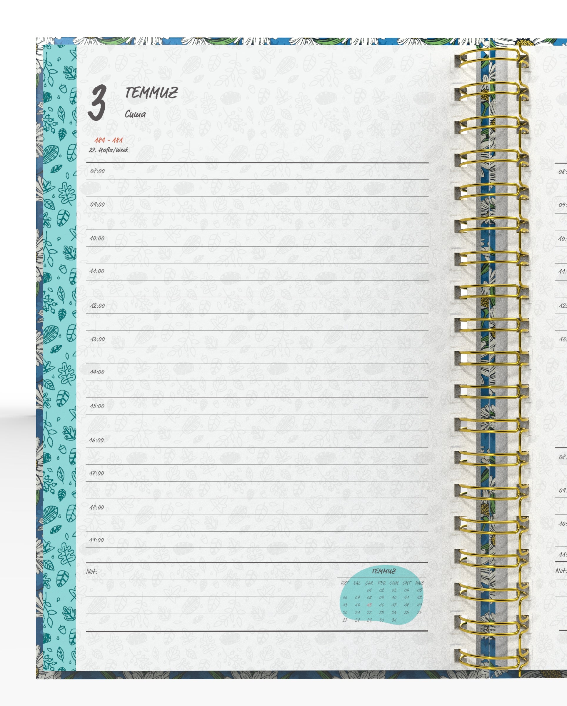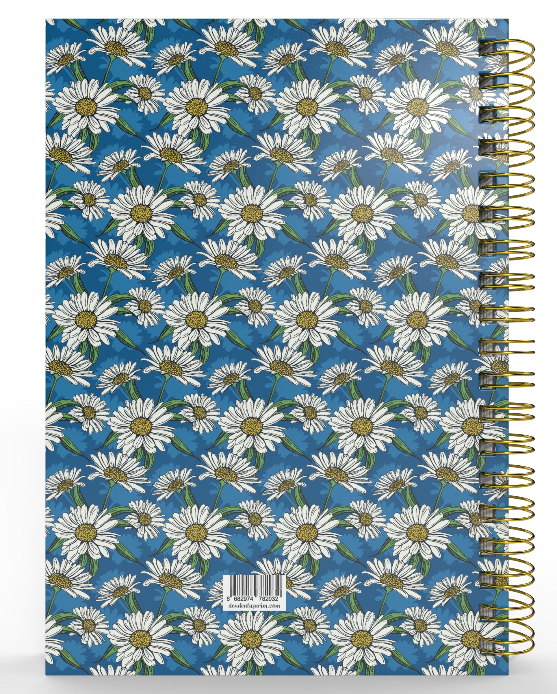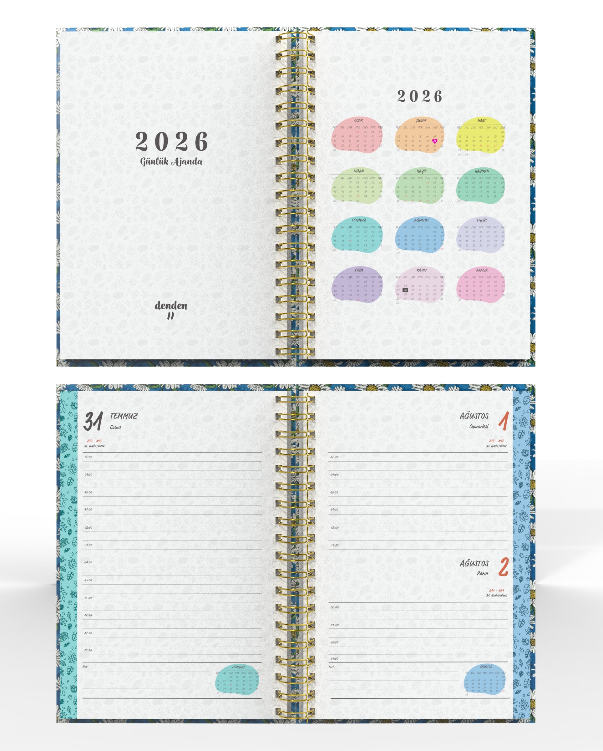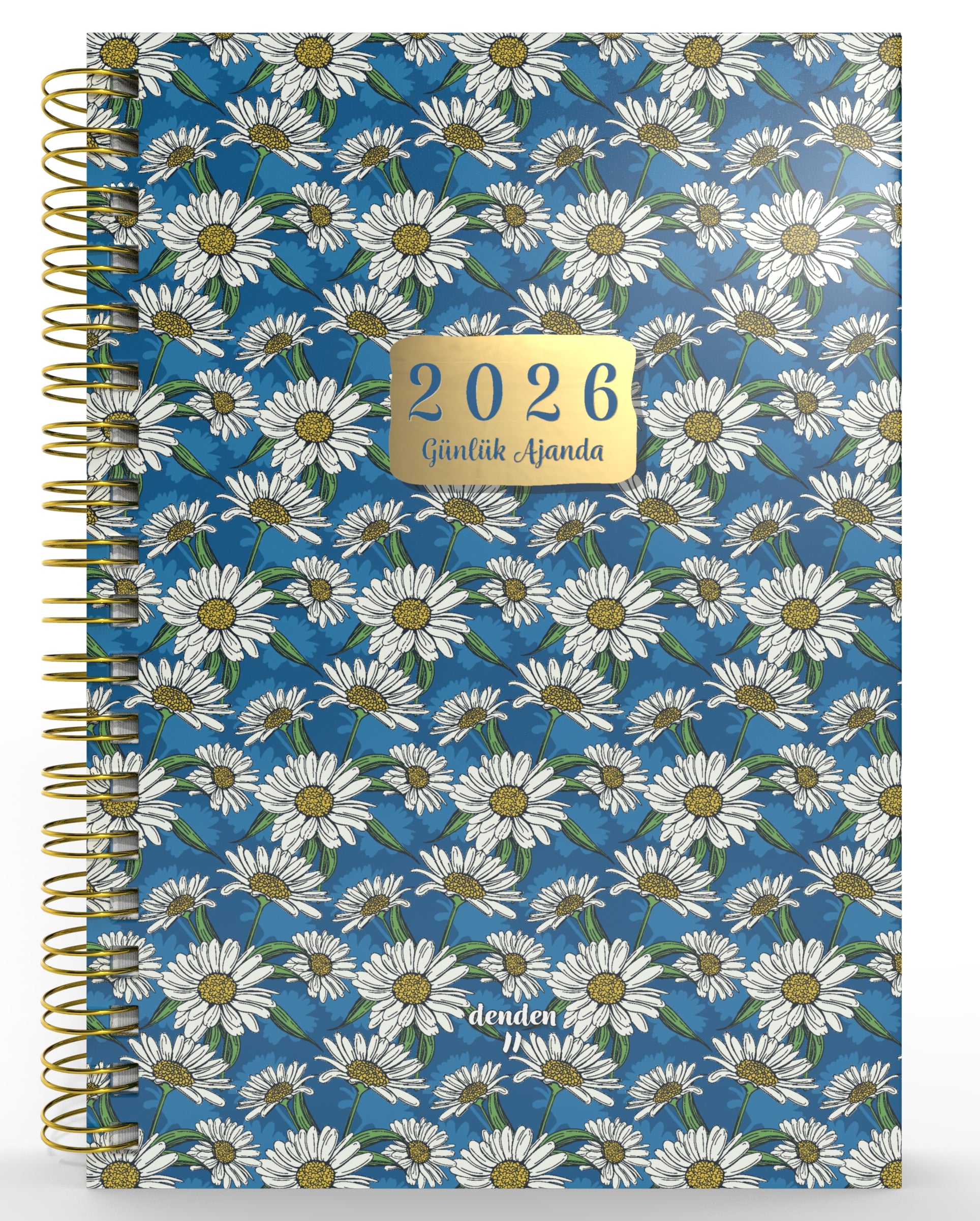 Bu çiçek desenli 2026 Günlük Ajanda, kuşe sıvamalı sert kapağı, altın varak yaldızlı detayları ve metal spiralli yapısıyla hem şık hem de kullanışlı bir tasarım sunuyor.