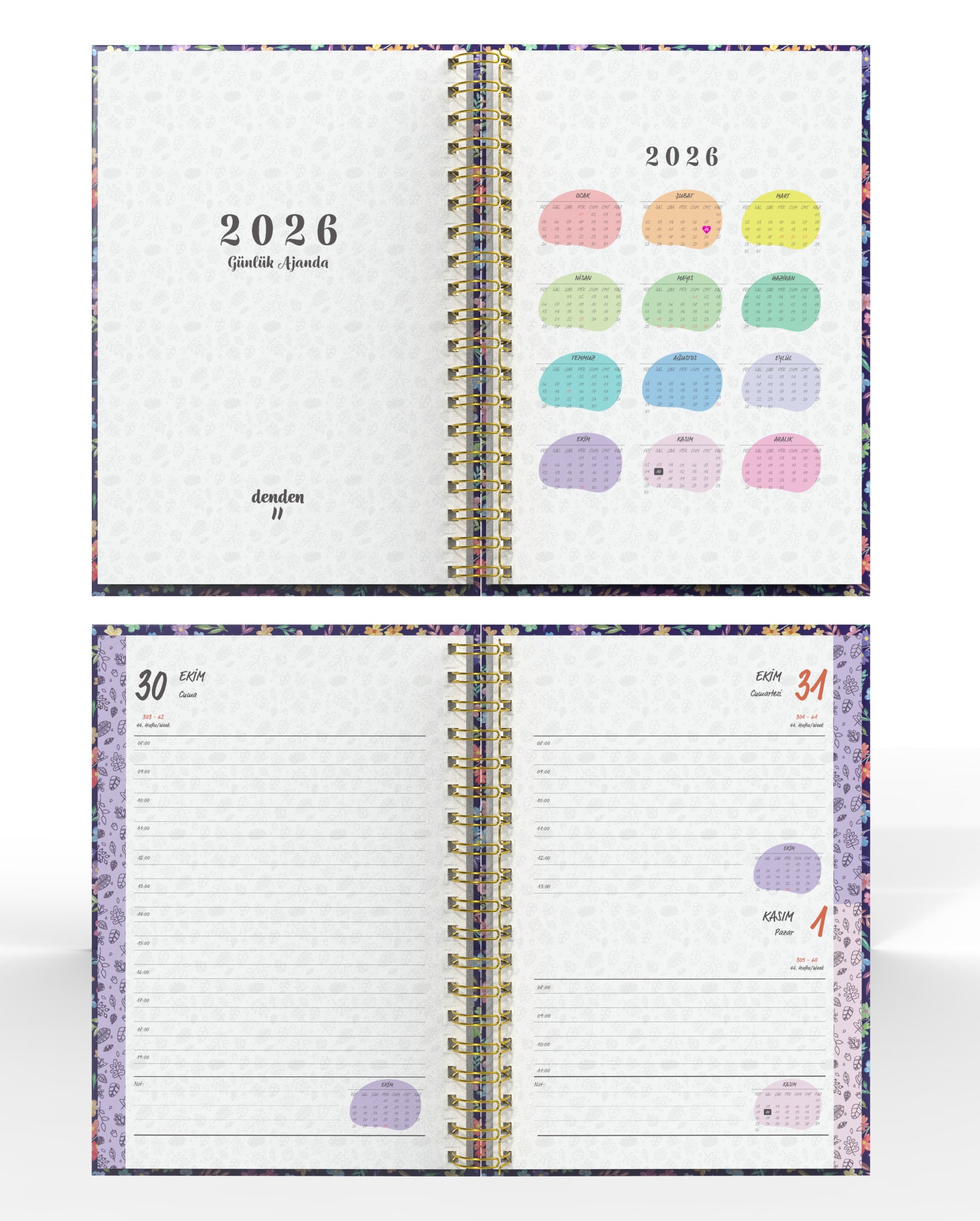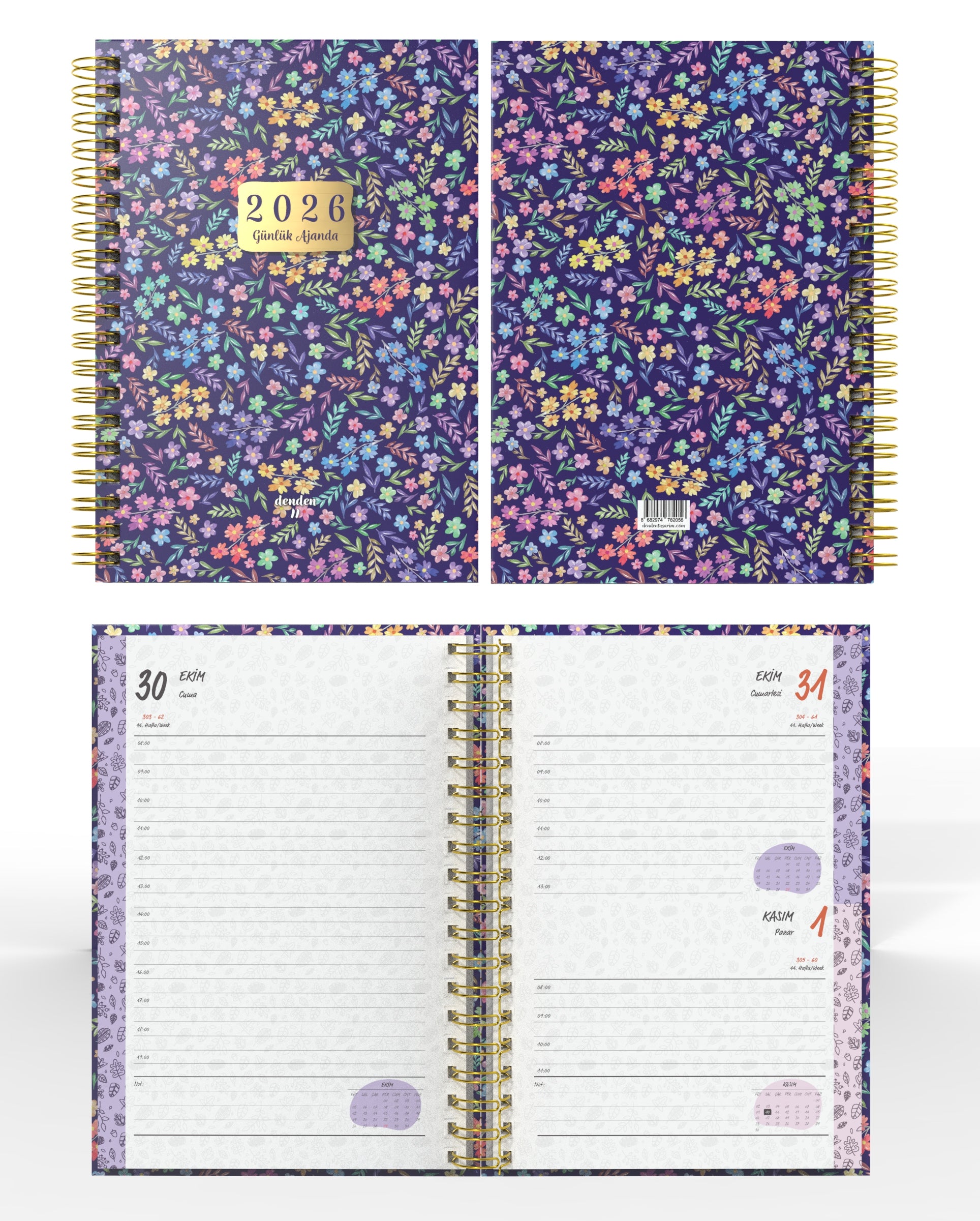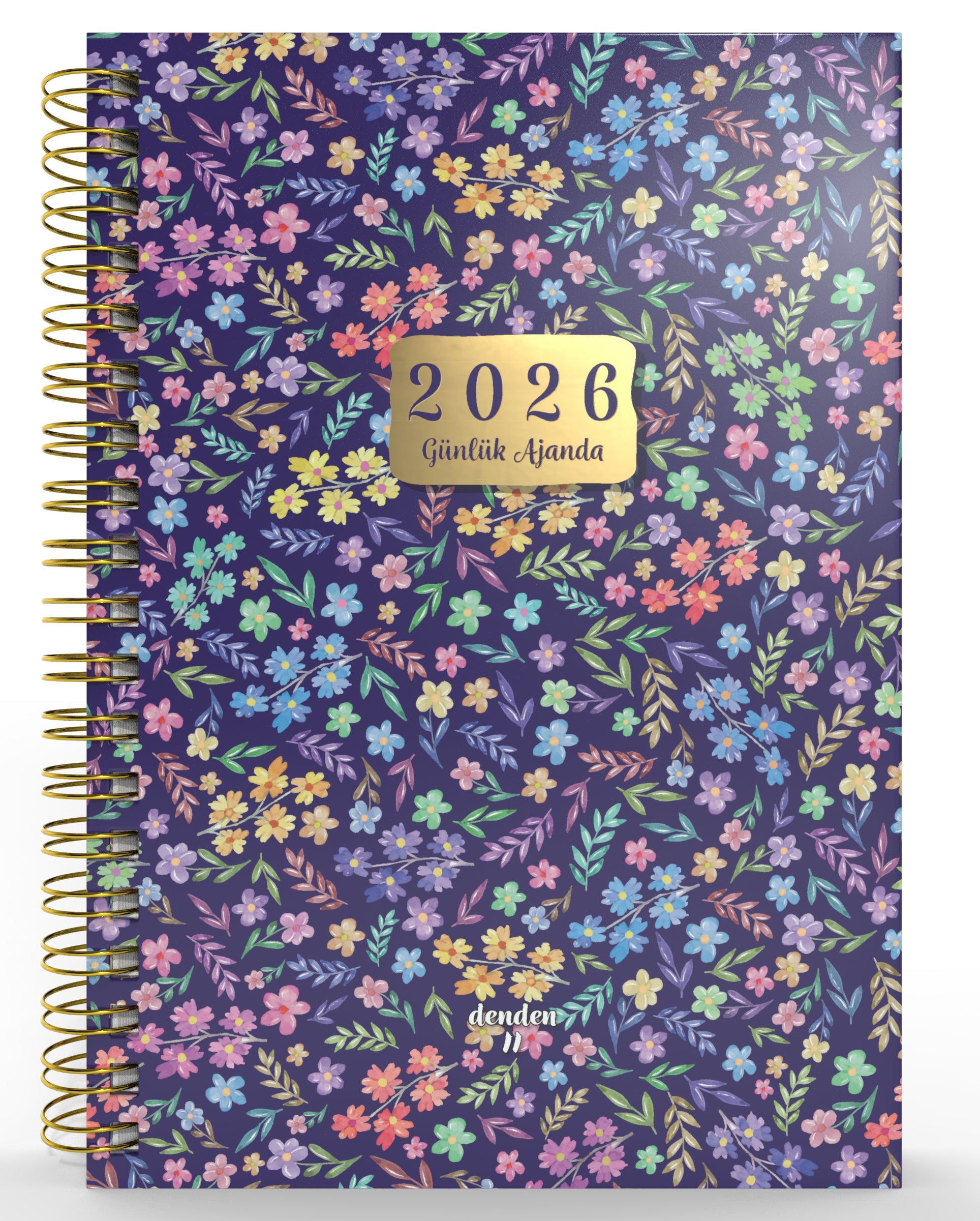 Bu kır çiçeği desenli 2026 Günlük Ajanda, kuşe sıvamalı sert kapağı, altın varak yaldızlı detayları ve metal spiralli yapısıyla hem şık hem de kullanışlı bir tasarım sunuyor.