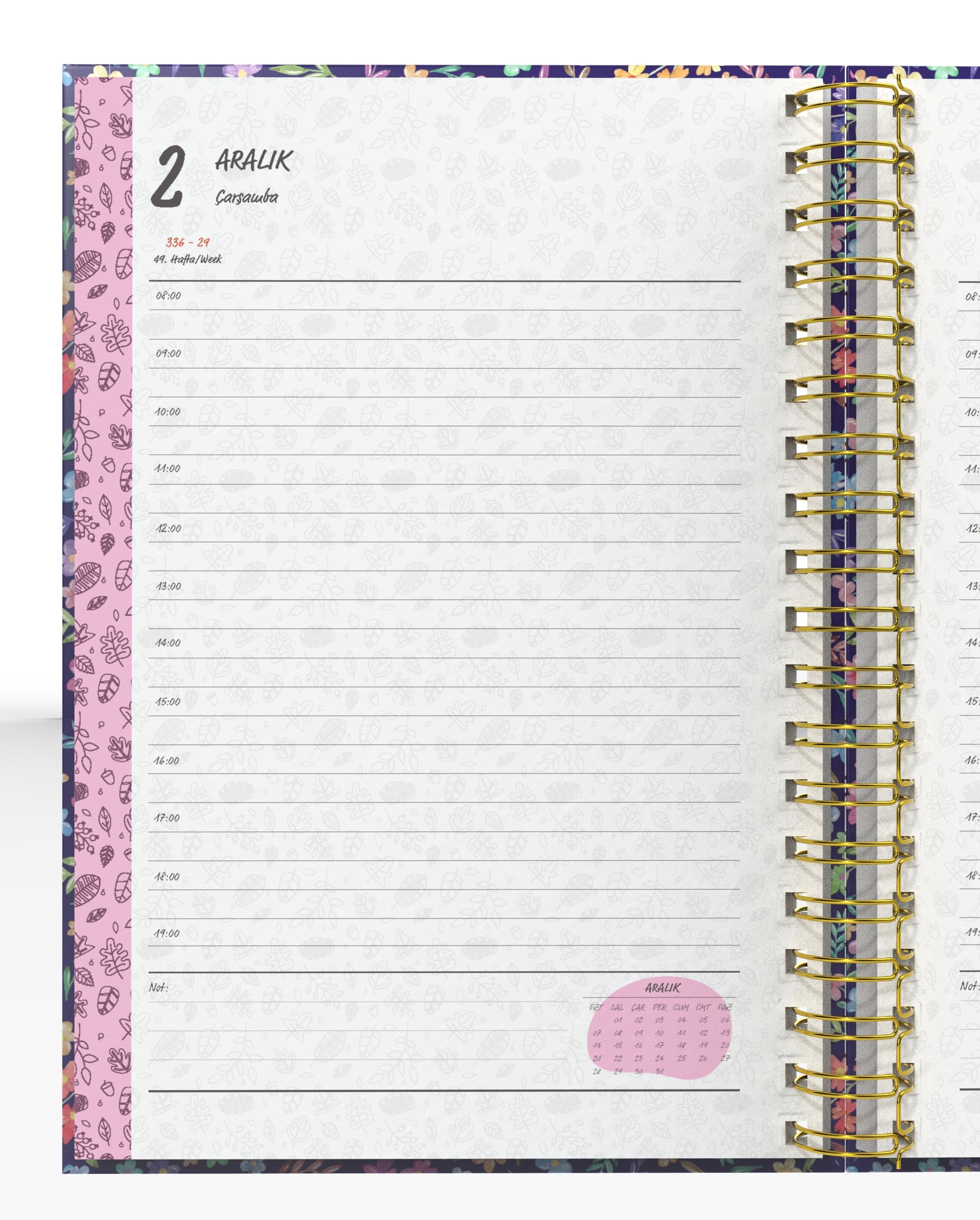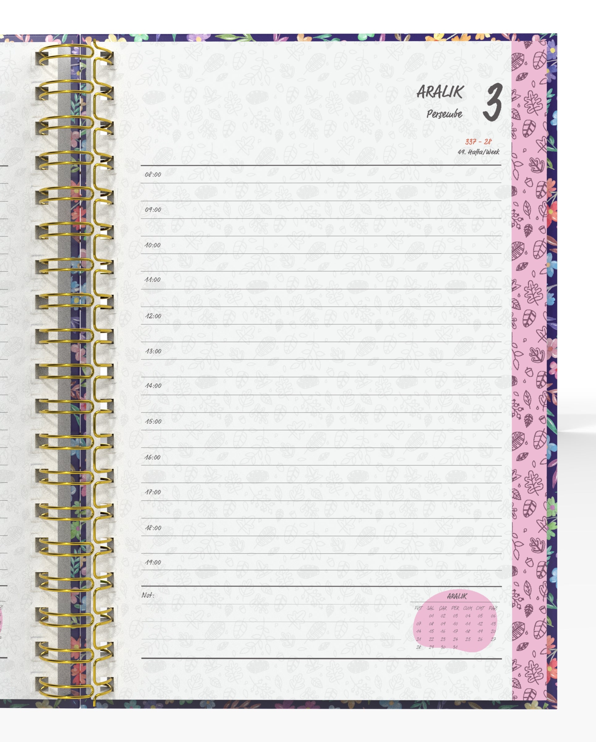 Günlük notlarınızı, hedeflerinizi ve planlarınızı zarif bir çiçek temasında toplamak için bu ajanda mükemmel bir seçim.