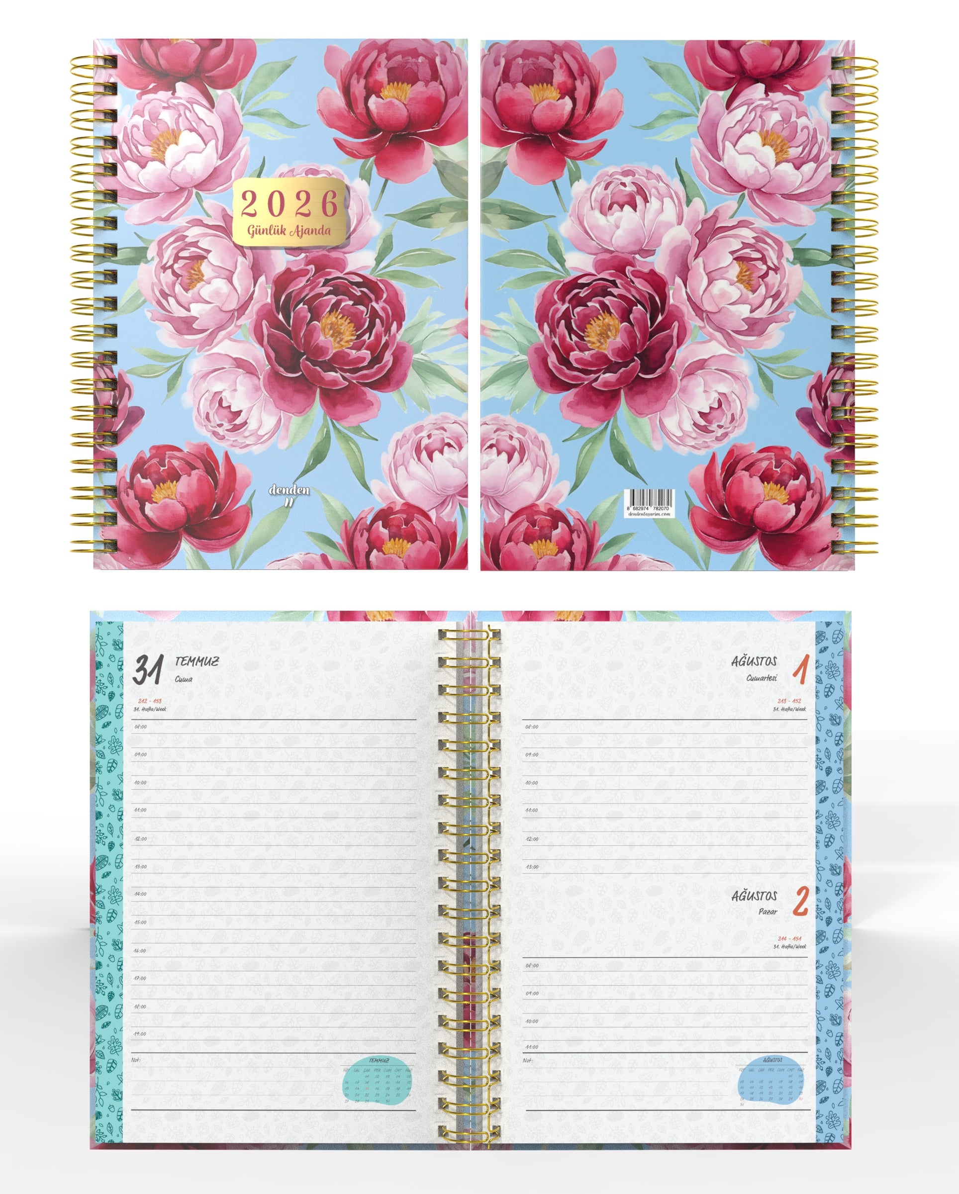Bu çiçek desenli 2026 Günlük Ajanda, kuşe sıvamalı sert kapağı, altın varak yaldızlı detayları ve metal spiralli yapısıyla hem şık hem de kullanışlı bir tasarım sunuyor.