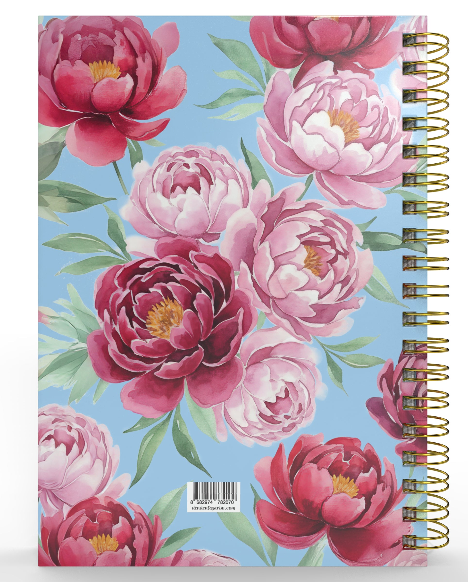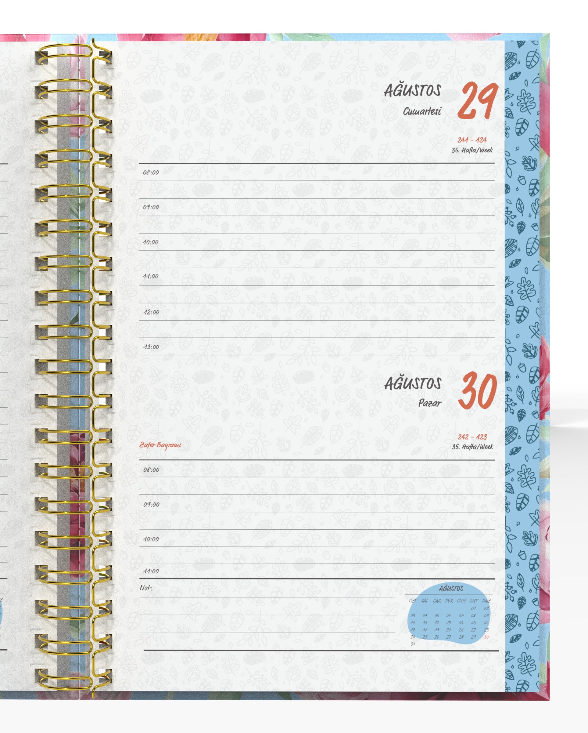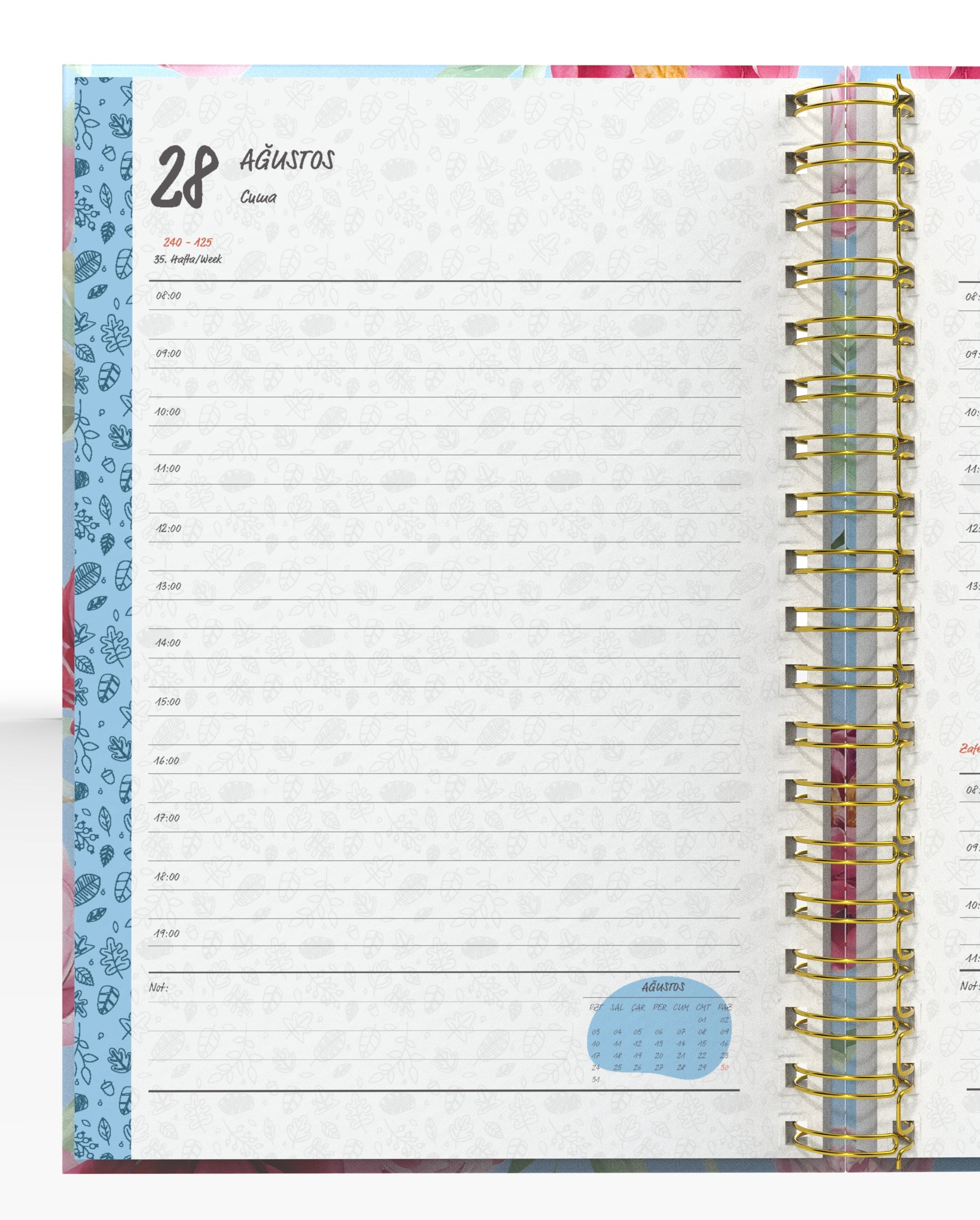 Günlük notlarınızı, hedeflerinizi ve planlarınızı zarif bir çiçek temasında toplamak için bu ajanda mükemmel bir seçim.