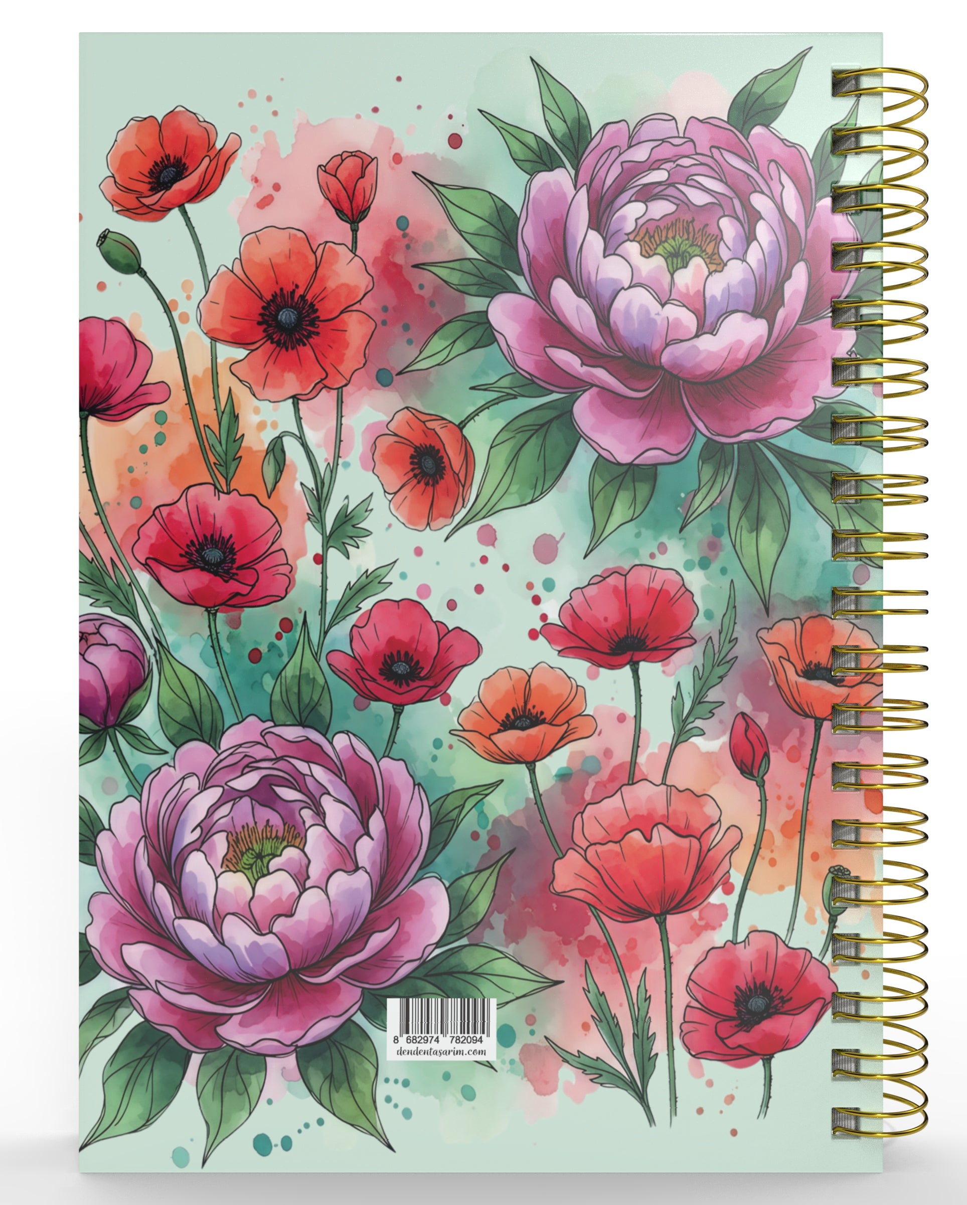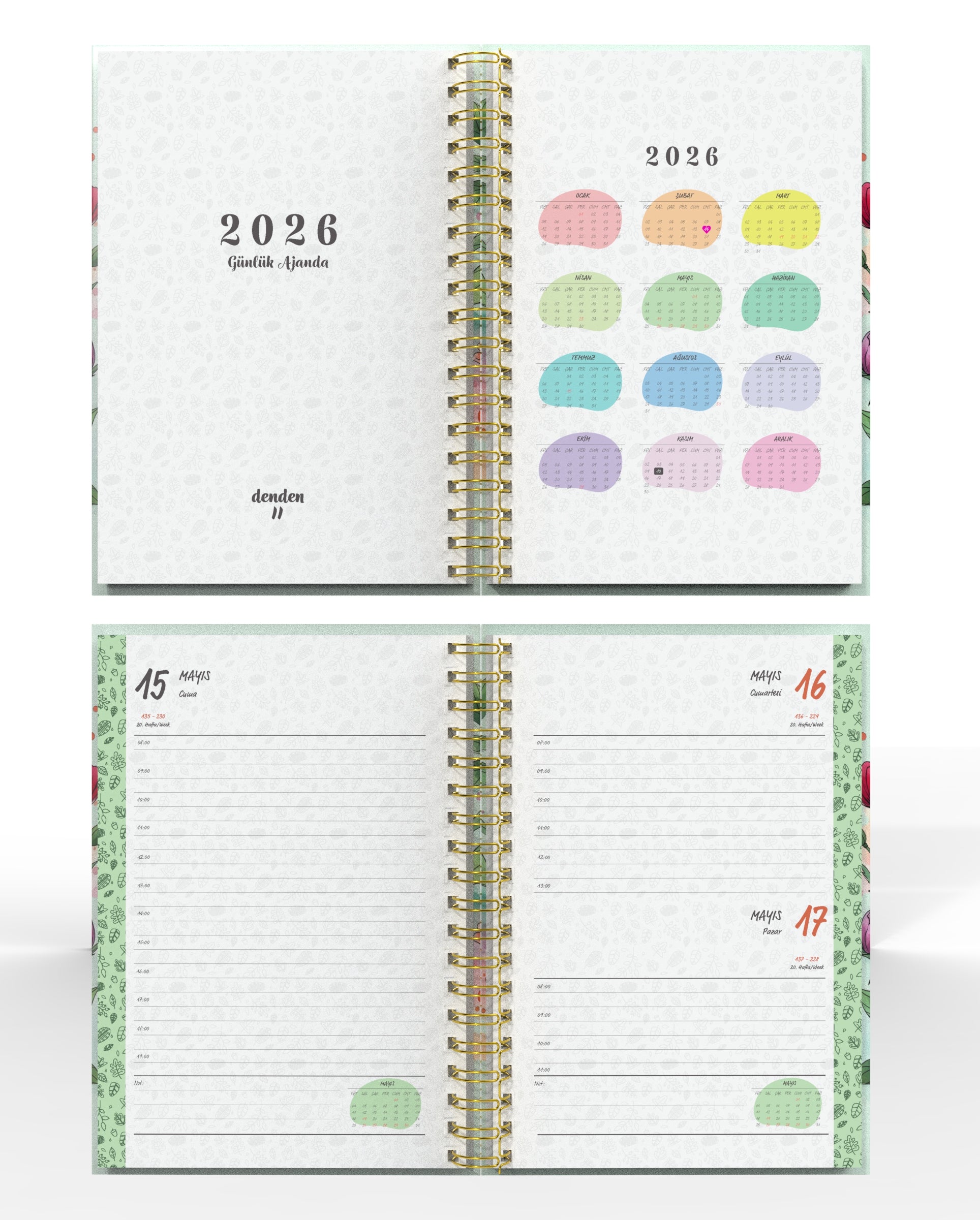 Bu çiçek desenli 2026 Günlük Ajanda, kuşe sıvamalı sert kapağı, altın varak yaldızlı detayları ve metal spiralli yapısıyla hem şık hem de kullanışlı bir tasarım sunuyor.
